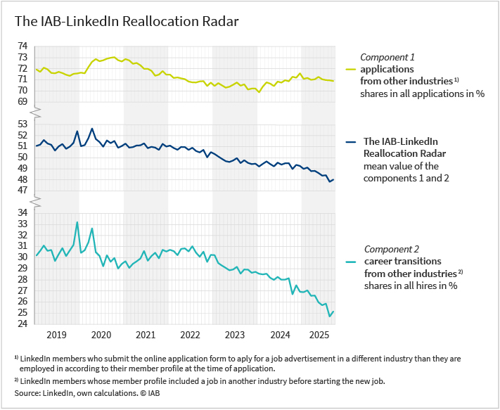 One indicator of this is the IAB-LinkedIn sector change radar. It can be used to track movements on the labour market practically in real time. This is because a change is usually preceded by an application - and it is precisely this data that is available in LinkedIn. We use this data to create a leading indicator for the industry changes expected in the near future.